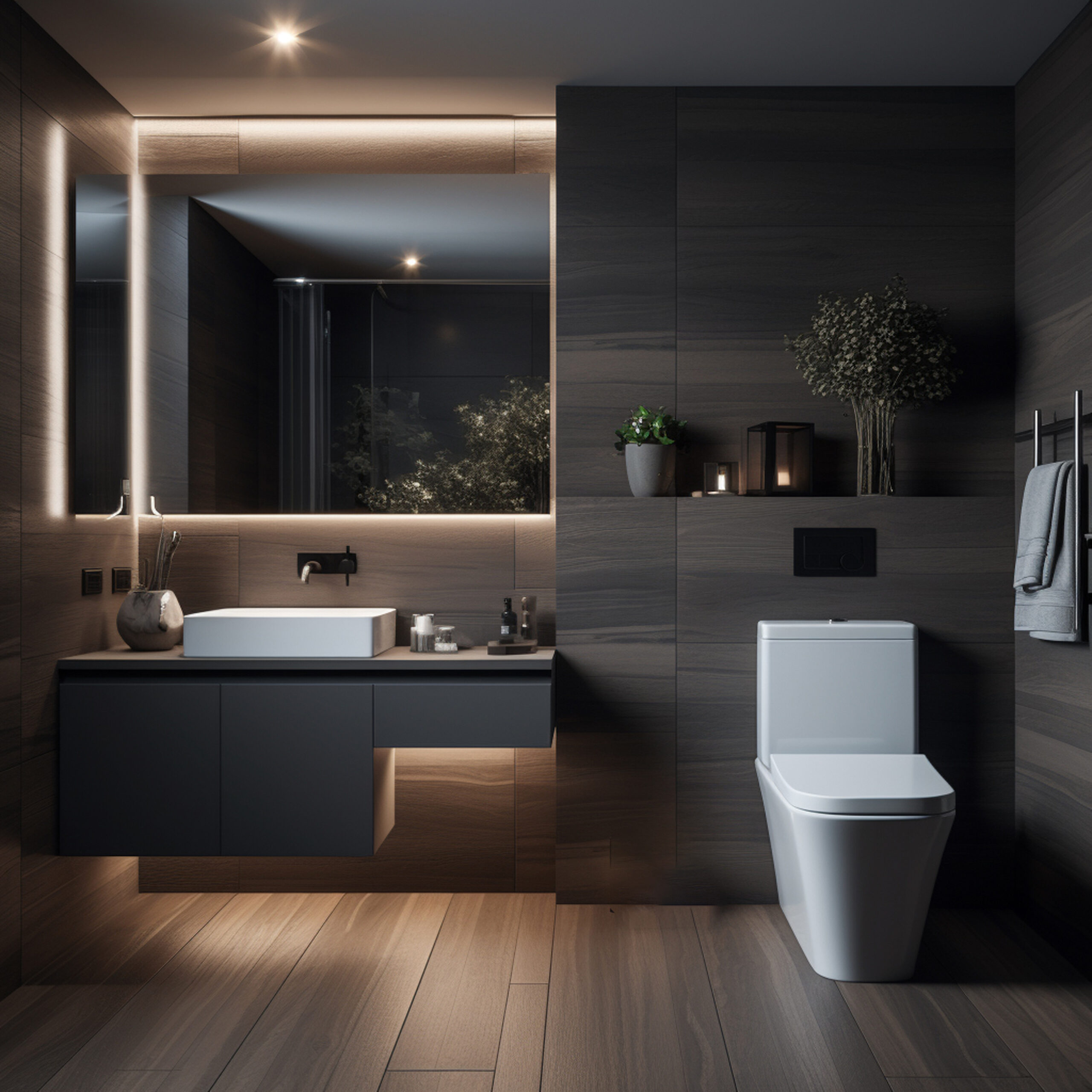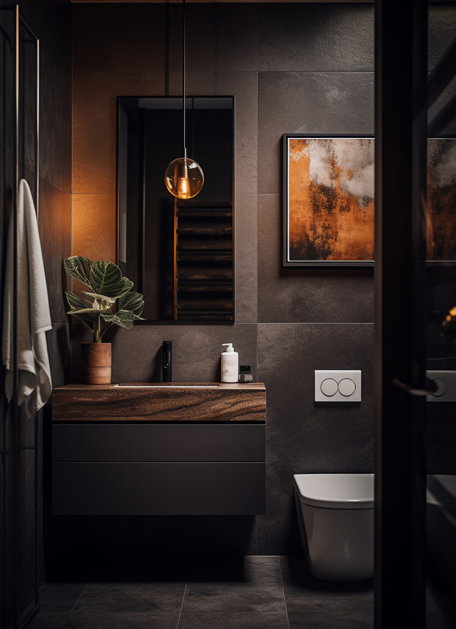 Dark bathroom designs create a bold and luxurious ambiance with deep colors like charcoal, navy, or black, often contrasted with rich metallic accents and textured materials such as matte tiles or dark woods. These designs evoke a sense of intimacy and sophistication, complemented by strategic lighting to enhance the dramatic atmosphere.